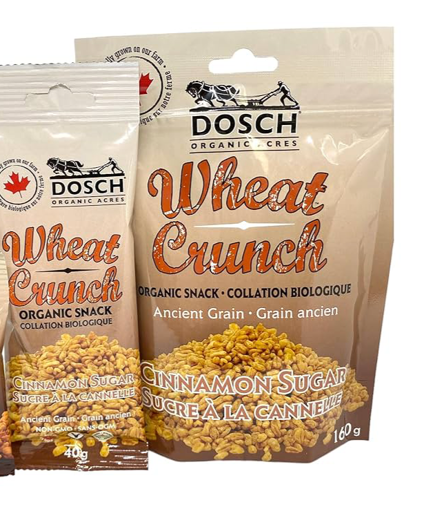 Sweet, crunchy, and perfectly spiced – Dosch Organic Acres Wheat Crunch – Cinnamon Sugar is a wholesome snack the whole family will love. Made with organic wheat grown on a family farm in Saskatchewan, Canada, these crispy wheat snack crisps are a deliciously sweet twist on the classic Wheat Crunch.