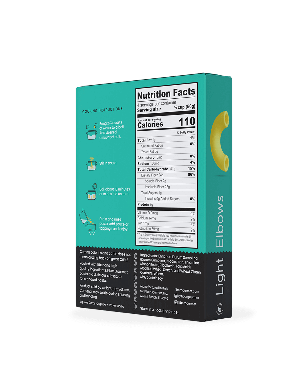 Enjoy the taste and texture of traditional pasta with none of the guilt! Fiber Gourmet Light Pasta Elbows are a delicious, fibre-packed alternative with 24g of fibre per serving and 25% fewer calories than traditional pasta.