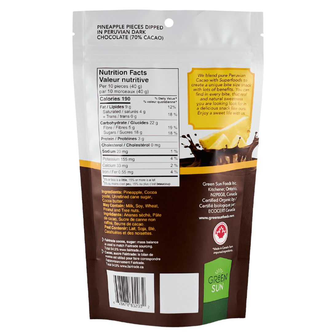 Treat yourself to the perfect balance of sweet and tangy with Green Sun Dark Chocolate Covered Pineapple. Each bite features juicy organic dried pineapple coated in smooth 70% Peruvian dark chocolate, creating a plant-based indulgence you can feel good about.