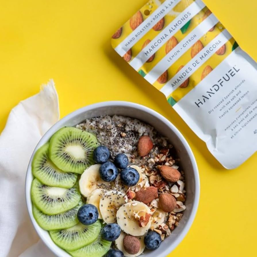 Elevate your snacking with Handfuel’s Dry Roasted Lemon Marcona Almonds – a premium, small-batch snack made with simple, whole food ingredients. These gourmet almonds are dry-roasted to perfection, lightly seasoned with lemon juice and sea salt, and packed with antioxidants, omega-3 fatty acids, and fibre. Crafted from a family recipe using only non-GMO ingredients, this snack is a delicious and wholesome alternative to your usual energy bar or salted nut mix.