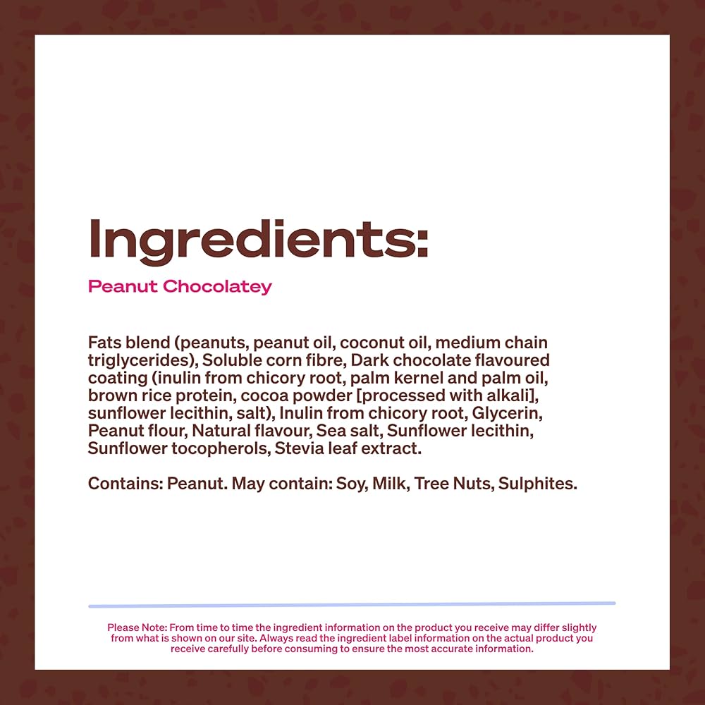 Fats blend (peanuts, peanut oil, coconut oil, medium chain triglycerides), soluble corn fibre, dark chocolate flavoured coating (inulin from chicory root, palm kernel and palm oil, brown rice protein, cocoa powder [processed with alkali], sunflower lecithin, salt), inulin from chicory root, glycerin, peanut flour, natural flavour, sea salt, sunflower lecithin, sunflower tocopherols, stevia leaf extract.