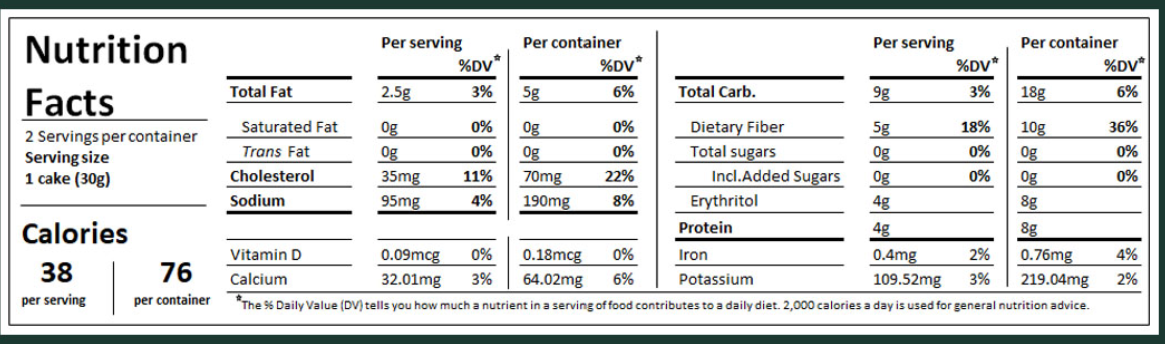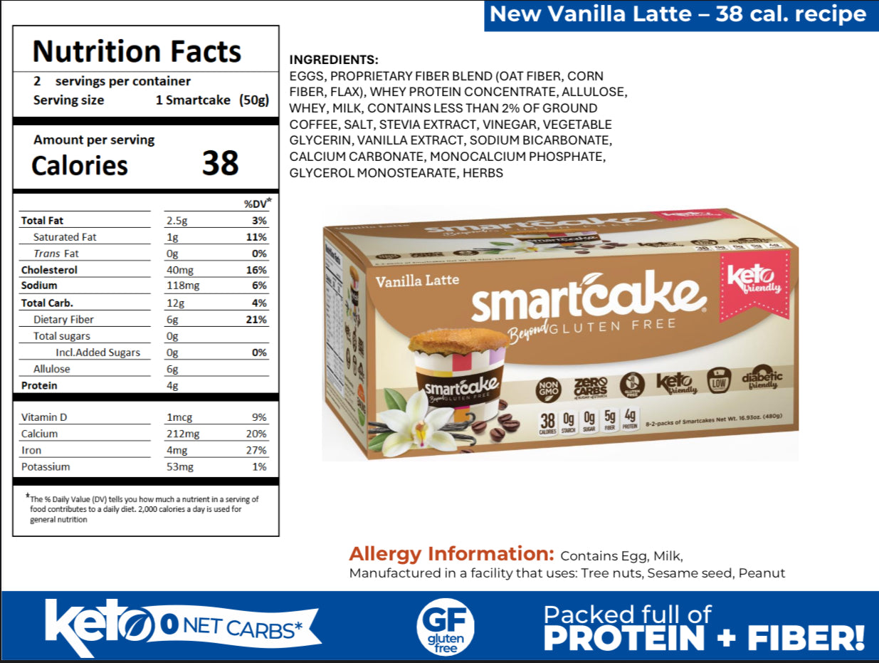Experience the balance of flavor and functional nutrition: 38 calories, 0g net carbs, gluten-free, and sweetened with allulose and stevia. Add SmartCake® Vanilla Latte Light to your routine and enjoy a proven low-calorie, keto-friendly snack.